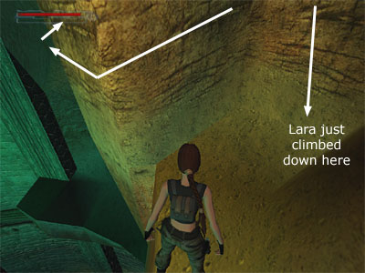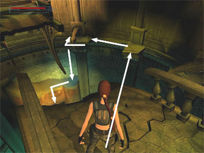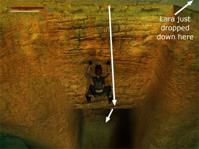 From the end of the broken bridge, take a carefully angled running jump to grab the small ledge with no gargoyle located between the two ledges that do have gargoyles. Pull up. Turn left, walk to the edge of the ledge and take a standing jump to grab the next ledge with the gargoyle. Lara won't shimmy all the way around, so pull up, drop and hang off the front of the ledge and shimmy around to the far side. Drop to the sandy ledge below.