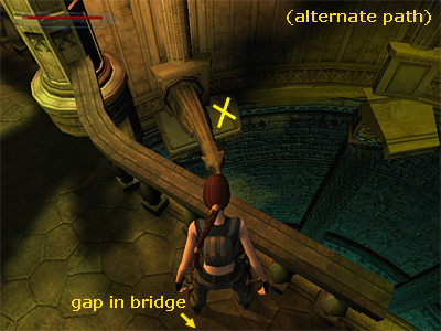 Instead of making the long diagonal jump from the end of the bridge near where you got the bandages, jump back across the gap to the other side of the bridge. Look down over the edge to spot a ledge with a gargoyle and one with no gargoyle to the right of it. Instead of aiming for the ledge with no gargoyle, you'll be jumping onto the one with the gargoyle. The spot is marked with a yellow X in the screenshot above.