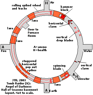 If you accidentally fall through a trapdoor while trying to reach one of the side levels (Hades, Neptune, etc.), either reload an earlier save or make your way through the basement to the elevator, which will take Lara back up to the main room.