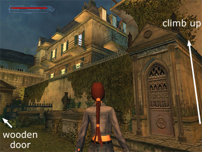 Climb on top of the crypt with the filigree door near the wall separating the graveyard from Francine's courtyard.