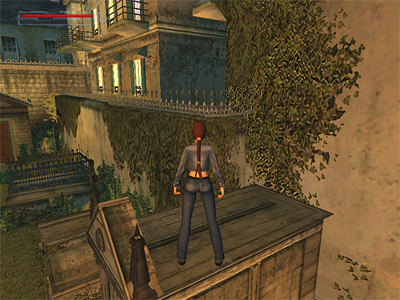 Once on top of the crypt, save your game. You'll need to make a tricky jump over the wall into the courtyard. If the jump is even a little short, she won't clear the wall and will either land back inside the graveyard or on top of the deadly spikes. This screenshot shows the general area, but this is not the spot from which Lara should jump.