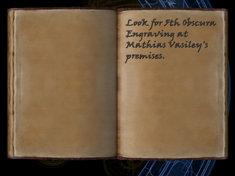 | 7/53 | (41) Mathias Vasiley in Prague. Has sent me four Obscura Engravings. He kept the fifth Engraving back. Wants more money. [includes image] | Margot Carvier's Apartment | screenshot | |