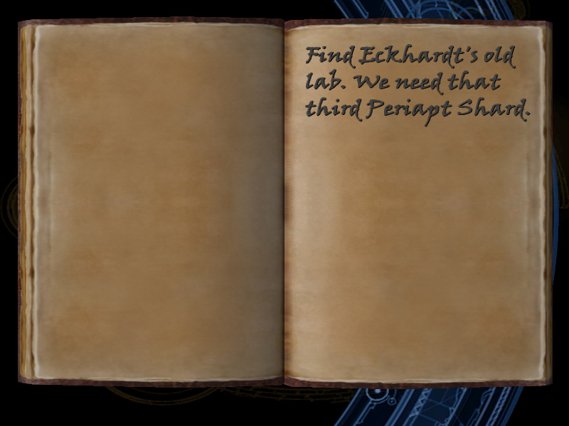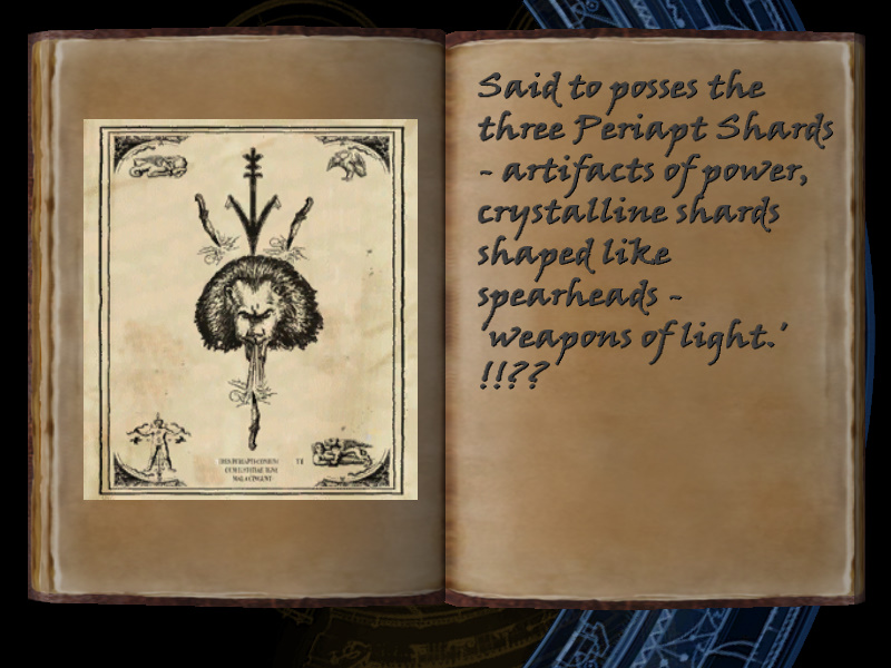 | 12/53 | (46) Said to posses the three Periapt Shards - artifacts of power, crystalline shards shaped like spearheads - weapons of light' !!?? [includes image] | Margot Carvier's Apartment | screenshot | |