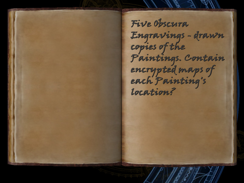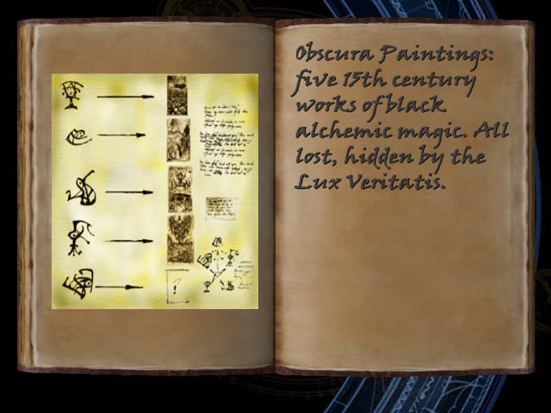| 5/53 | (39) Obscura Paintings: five 15th century works of black alchemic magic. All lost, hidden by the Lux Veritatis. [includes image] | Margot Carvier's Apartment | screenshot | |