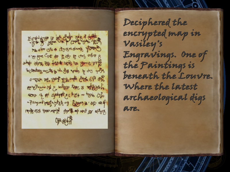 | 8/53 | (42) Deciphered the encrypted map in Vasiley's Engravings. One of the Paintings is beneath the Louvre. Where the latest archaeological digs are. [includes image] | Margot Carvier's Apartment | screenshot | |