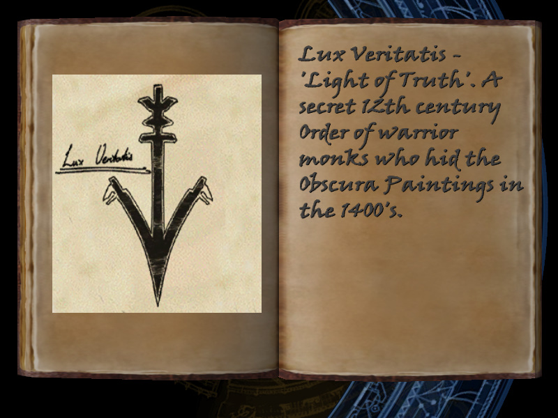 | 11/53 | (45) Lux Veritatis - 'Light of Truth'. A secret 12th century Order of warrior monks who hid the Obscura Paintings in the 1400's. [includes image] | Margot Carvier's Apartment | screenshot | |