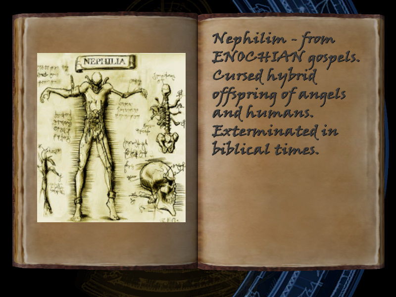 | 15/53 | (49) Nephilim - from ENOCHIAN gospels. Cursed hybrid offspring of angels and humans. Exterminated in biblical times. [includes image] | Margot Carvier's Apartment | screenshot | |