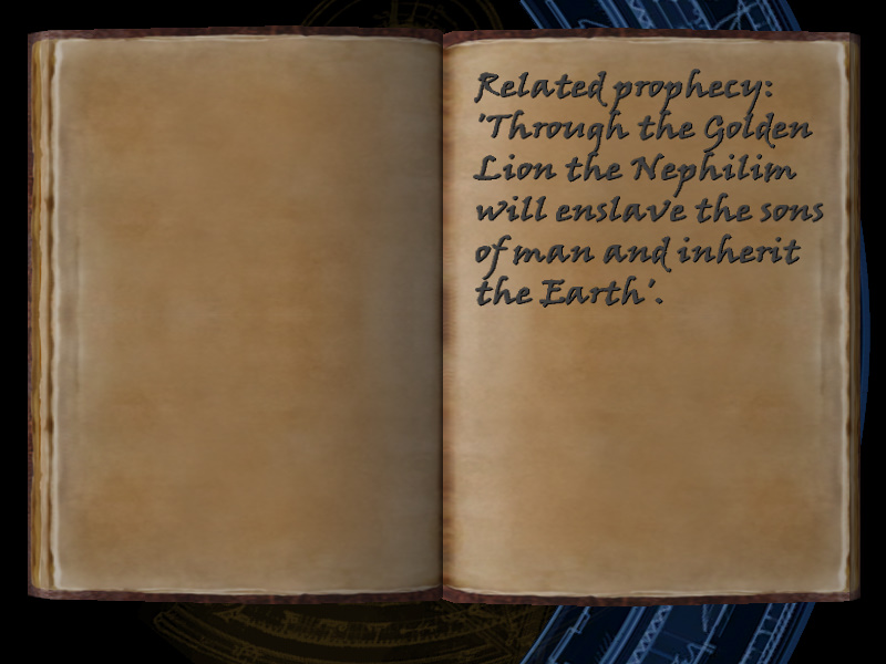 | 16/53 | (50) Related prophecy: 'Through the Golden Lion the Nephilim will enslave the sons of man and inherit the Earth'. | Margot Carvier's Apartment | screenshot | |