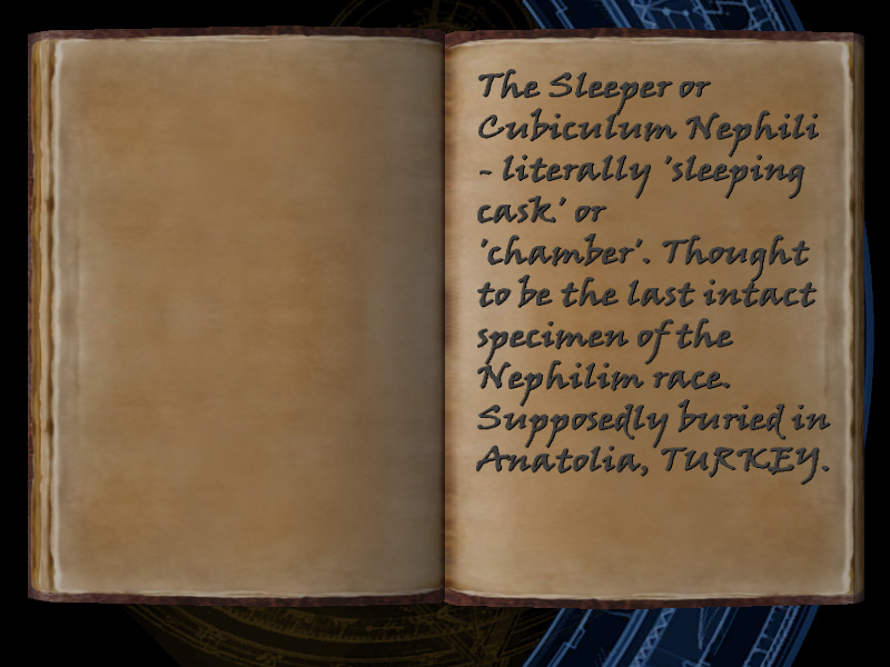 | 17/53 | (51) The Sleeper or Cubiculum Nephili - literally 'sleeping cask' or 'chamber'. Thought to be the last intact specimen of the Nephilim race. Supposedly buried in Anatolia, TURKEY. | Margot Carvier's Apartment | screenshot | |