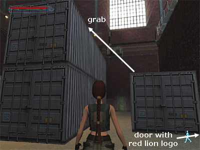 Climb onto the single crate just to the left (when facing the door with the lion). From there, jump to grab the edge of the two stacked crates. Pull up.