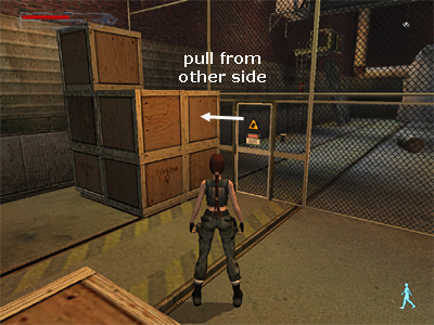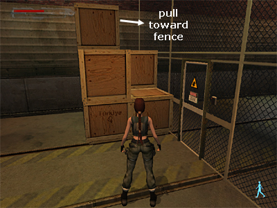 Climb over the crates nearest the door in the fence. With Lara standing on the crate in the corner between the fence and the wall, turn so the fence is on Lara's left. Pull the crate in front of her toward the wall. Pull several times to move it as far as it will go. You won't be able to pull it all the way with Lara standing there, but after doing this, the crates will be arranged as shown in the screenshot below.