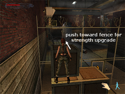 Again, do not climb over the topmost crate to get to the other side of it. Climb down and go around. Climb onto the two crates next to the stack of three. Then sidestep to the left onto the narrow ledge formed after moving the topmost crate. If you have trouble with that, try turning so Lara's back is toward the fence and then sidestep to the right. Or, use stealth mode, which seems to work well. Push the topmost crate toward the fence to get an upper-body strength upgrade.