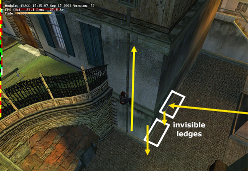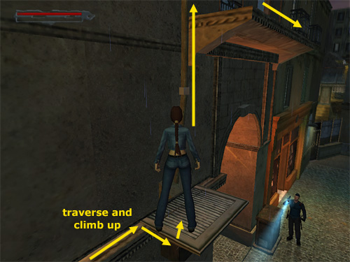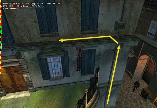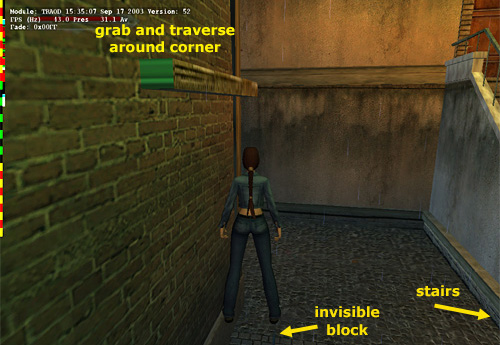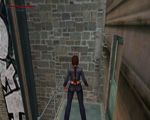Take a look around. If you're familiar with the parts of this level that appear in the "real" game, you'll notice that the building across the grassy courtyard is where Lara finds the other crowbar and breaks down the shed door to get the M-V9. On the left side of that building is the gantry gate key, etc. If you fly around, you can see how it all fits together. Dropping into the grassy courtyard triggers the cut scene leading into the Derelict Apartment Block level. It looks as though Lara was originally intended to approach it from this side. For maximum pickups, try starting the level with the fly cheat enabled (or use one of the downloaded savegames linked on the first page). Open the door between the starting area and the alley where you find the Courtyard Key. Then save your game. Once that door is open, you can play without the cheat. Do the "real" areas first up to the point where you get the M-V9 in the shed. Don't bother getting the Gantry Gate Key since you won't be exiting that way. Instead, climb back down to the starting point and explore the unfinished area. Get all the items there and shoot the gendarme if you like. Then proceed to the grassy courtyard to finish the level. ALTERNATE METHOD FOR ACCESSING SECRET AREA: You can also get to this area using a bug in the Parisian Ghetto level. Immediately after leaving the Serpent Rouge nightclub, when you step out onto the small balcony, save your game in a new slot, as you will need to reload from here to continue the game. But do not reload now or the bug won't work. Position Lara where she is the screenshot below. Then crouch and crawl forward and a little to the left.