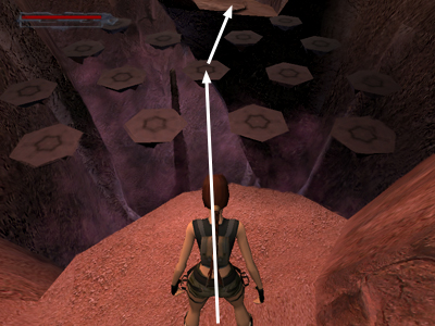 Back away from the edge so Lara is standing at the top of the slight slope in the tunnel opening (where there's a seam between the textures). Take a standing jump (no need to run) to the small, floating platform that's third from the left in the second row of platforms. Walk to the front edge of the small platform and jump to the stone ledge.