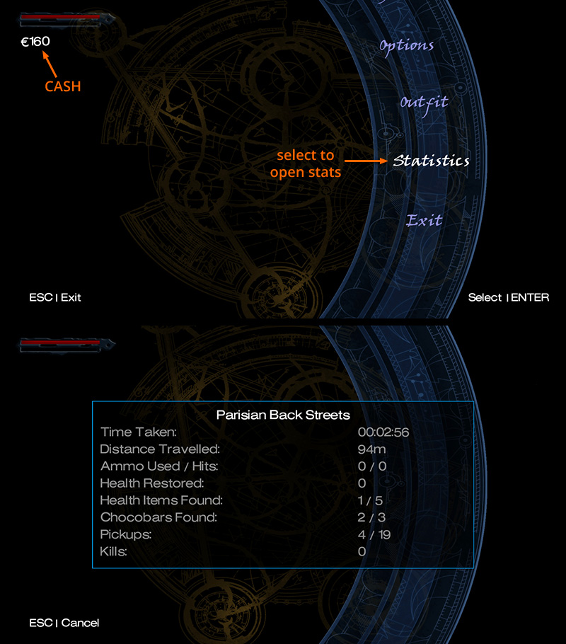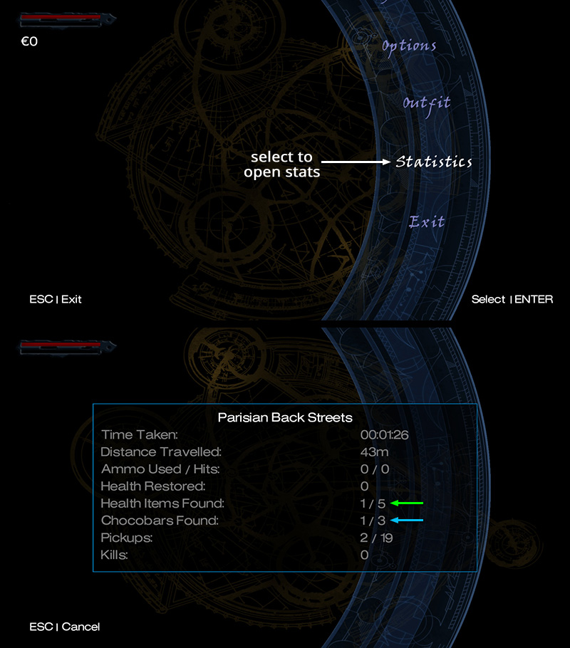 NOTE: The "Tactical Medicine" achievement/trophy requires you to, "collect all medipacks in a single walkthrough." I'm not sure whether this means every health item or just the actual medipacks. I would err on the side of caution and just try to get everything. The in-game Statistics screen helpfully tracks chocolate and health items. (More on inventory and stats below.)