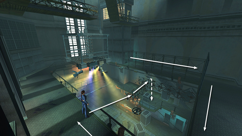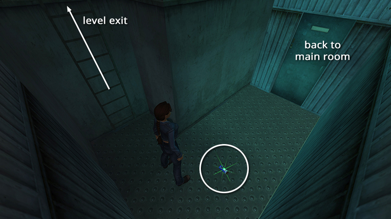 SHORTCUT FROM MOVING RIG TO LIGHTING BOOTH: The following jump is a little tricky, so you might want to save the game first and/or use the regular route described in the main walkthrough. Instead of jumping across to the opposite corner of the lighting rig, position Lara about halfway along the edge of the moving rig nearest the glassed-in LIGHTING BOOTH. Turn so she faces the left corner of the lighting booth, wait until the rig moves all the way up, then side flip to the right to clear the fence and land just outside the lighting booth door. (screenshots) Positioning is key here. If Lara is too far to the right before jumping, she'll overshoot the walkway. If she's too far to the left, or not angled correctly, she'll hit the fence. After making the jump, continue by kicking down the drawbridge for the strength upgrade.
