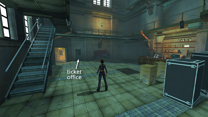 If you missed any pickups, including the items in the TICKET OFFICE on the ground floor, you can backtrack now. Exit through the door near where you picked up the last chocolate bar. (screenshot) You emerge on the upper-level walkway of the main room. The door closes and locks behind you. The stairs ahead are blocked, so follow the walkway all the way around to the other side. Jump from the first break in the railing to the jutting support strut. Cross the strut and drop down near the movable speaker cabinet. (screenshot) Continue downstairs and use the TICKET OFFICE KEY you found in the LIGHTING BOOTH to unlock the TICKET OFFICE door. (screenshot) Inside you'll find €160 cash and another TICKET OFFICE KEY. (22) (Both of these pickups are noted above.) You don't really need this second key. Perhaps it was originally intended to open something, but it doesn't seem to have a purpose now. When you have everything, climb back up to the LIGHTING BOOTH the way you did before. (See above if necessary.)