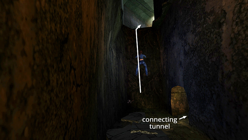 If Lara falls into one of the first two pits, either reload or kill the rats—assuming Lara will even target them—climb back out, and continue. The first pit has one root-covered wall Lara can climb. (screenshot) If you fall into the second pit, you may be able to stand on the rubble and jump up to grab the uneven ledge above (screenshot), but this is tricky. You can also crawl through the low tunnel to get back to the first pit, then climb the root-covered wall.