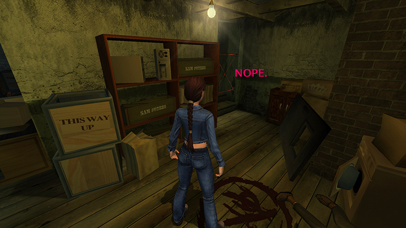 If you take too long, if the flames in the pipe overtake Lara, or if you try to exit through the front door (screenshots), rather than the trapdoor, the building explodes. If you make it to the end of the tunnel, all is well.