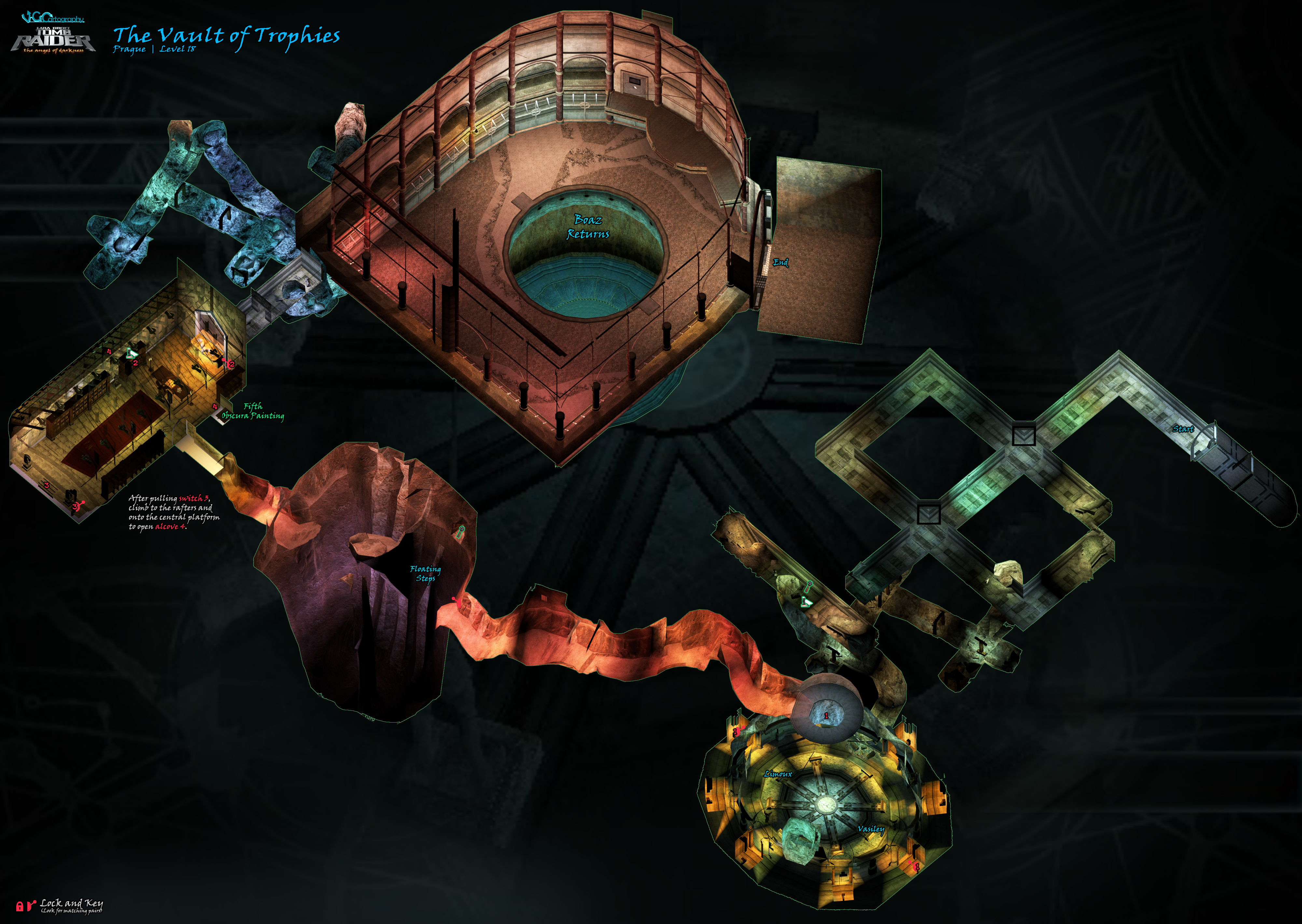 *NOTE ON LEVEL MAPS: VGCartography's Angel of Darkness maps follow a slightly different level-numbering convention than I do. You'll notice most of the Parisian Ghetto-adjacent areas on the same large map. Later, the elemental levels off the Hall of Seasons are included on the same map as the hub level. Visit VGCartography on DeviantArt and follow on Twitter/X and YouTube for more fantastic game maps.