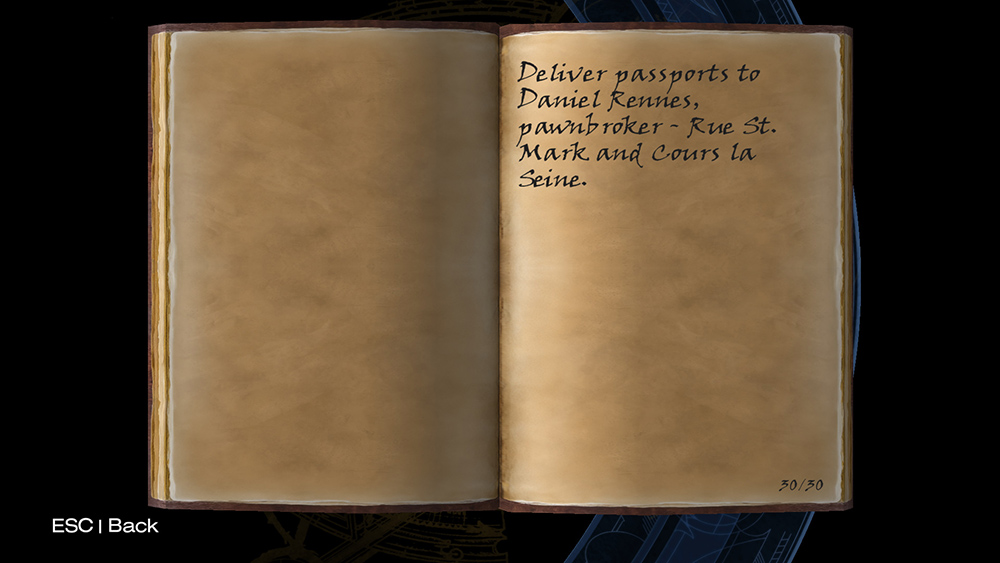 | 30 | Deliver passports to Daniel Rennes, pawnbroker - Rue St. Mark and Cours de la Seine. | Bouchard's Hideout | screenshot | |