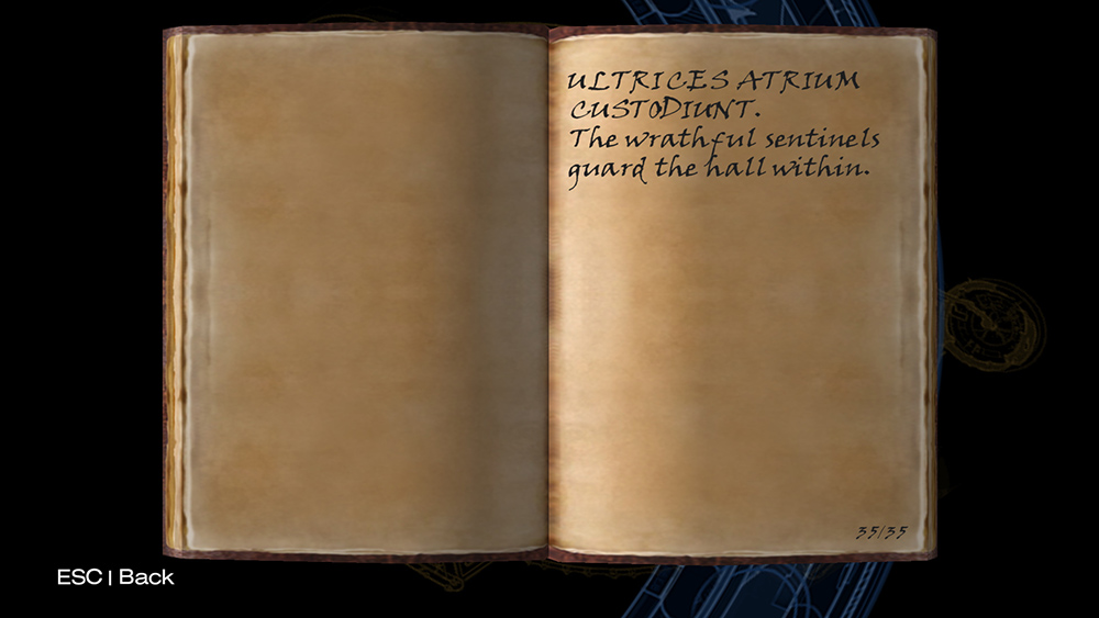 | 45 | TRES PERIAPTI CONIUNCTI CUM IUSTITIAE IGNE MALA CINGUNT. The three Periapts joined together burn with righteous light to confine evil. (Secret room at Vasiley's) | Monstrum Crime Scene | screenshot | |