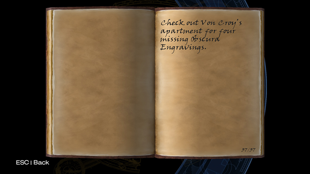 | 37 | Check out Von Croy's apartment for missing Obscura Engravings. | Von Croy's Apartment | screenshot | |