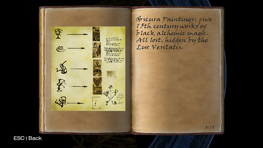 | 11 | Lux Veritatis - 'Light of Truth'. A secret 12th century Order of warrior monks who hid the Obscura Paintings in the 1400's. [includes image] | Margot Carvier's Apartment | screenshot | |
