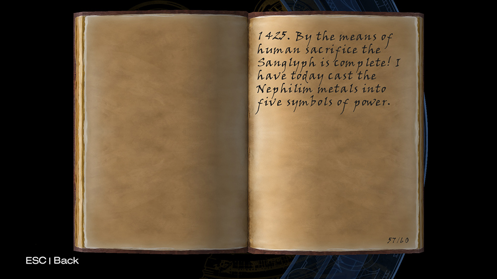 | 57 | 1425. By the means of human sacrifice the Sanglyph is complete! I have today cast the Nephilim metals into five symbols of power. (Open book in Laboratory) | Eckhardt's Lab | screenshot | |