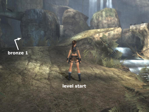 UPSTREAM TO THE TEMPLE: From the starting point (CHECKPOINT 1), go forward and left to find a bronze reward (1/10) under the stone archway. (This screenshot shows the spot.) Continue through the archway and out the other side, wade across the stream and climb onto the ledge ahead.