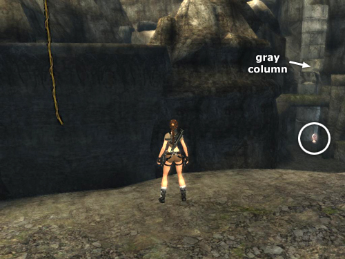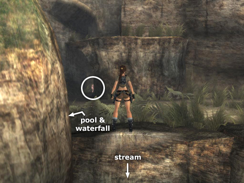 Here you'll find some small boulders that Lara can kick by pressing Interact (E on the PC, Triangle on the PS2, Y on the Xbox), the rough equivalent of Action in earlier games.(****) There's no purpose to this except to practice the controls. You'll also find another bronze reward (2/10) ahead on the left, tucked into a corner. (screenshot) Grab it and return to the pool below the falls.