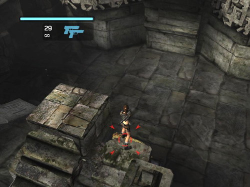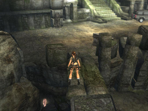 Notice the silver reward in the room below the trap. You'll retrieve that shortly. For now, continue along the hall to CHECKPOINT 15. Round the next corner and stop at the edge of the pit. Another jaguar lurks below, so don't just drop down. Instead step off and grab the edge. Traverse to the right and then drop to the handhold below. Climb to the right a little more and drop onto the raised area in the corner. (screenshot) The jaguar can't reach Lara here, so you can shoot it with pistols before hopping down to the floor.