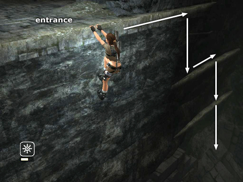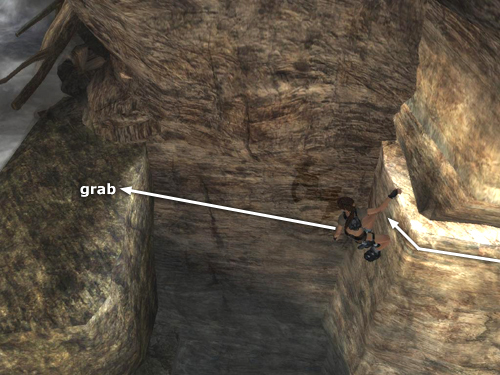 NOTE: The saving grab is a new feature in Legend. When jumping to grab a ledge, pole, or other handhold, occasionally Lara will fall a bit short and grab on using only one hand. When this happens a warning icon appears (a yellow hand on the PC, Triangle button on the PS2, Y button on the Xbox). Quickly press Interact to grab with both hands; otherwise Lara will fall. This may not happen right here, but you will see it throughout the game.