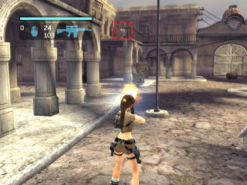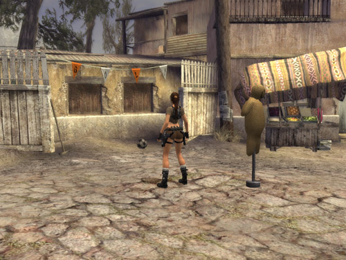 PARAÍSO TOWN SQUARE: When the cut scene ends, Lara is standing on the wide stairs of the big building (town hall? church?) with armed men closing in. Take cover. The area below the stairs on the right is one good hiding place. Only the one soldier on the veranda to the right can hit Lara from here. Then gradually move out and deal with the other 3 mercenaries one or two at a time. (strategy and screenshots)