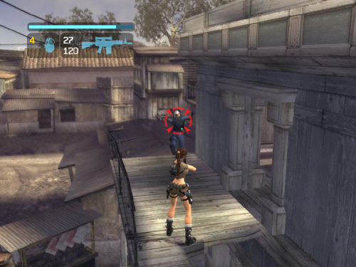 Then run out across the roof to the back corner. When Lara is standing there, the neighboring building shields her from the 2 shooters farther along the street (one on the ground, one above), while allowing you to target the man (or 2 men) on roof across the street. Once you've dealt with them, move onto the peak of the roof to target the remaining enemies.