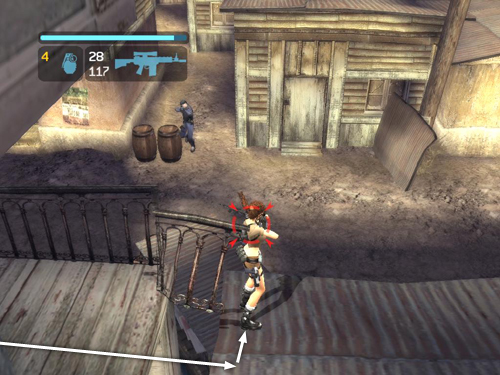 After defeating the first group of mercenaries, either grapple-swing across the road to the roof of the next building (screenshot) or climb down and pick up the various dropped health packs, ammo and grenades. Another ASSAULT RIFLE is available here instead of ammo if you took the shotgun in the previous area.