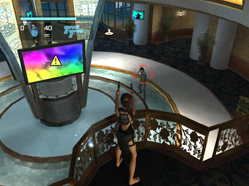 Don't go down the stairs yet. Instead, run back toward the entrance and turn into the small lounge, where 2 more goons will be waiting. If you don't see them immediately, go through the lounge and turn left. They'll be on the balcony ahead. This balcony is also a good vantage point for taking out any stragglers that weren't killed by the chandelier, as well as the sixth bad guy, who enters on the lower level when everyone else is dead.