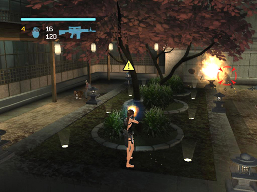 TAKAMOTO'S ROOFTOP GARDEN: A group of security men arrive. Lara is up against 3 thugs and a pair of pit bull terriers. The dogs will quickly knock Lara down, preventing her from fighting back. To avoid that, jump up onto the raised garden bed. (screenshot) Deal with the men first. Along with the usual bullets and grenades, you can shoot the lanterns to cause extra damage. Just be sure Lara isn't standing too close when that happens. Then kill the dogs with pistols while still standing on the planter. Pick up any dropped health packs, grenades and rifle ammunition.