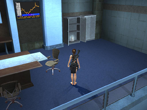OFFICE WITH CUBICLES & BIG-SCREEN DISPLAY: Enter, crossing CHECKPOINT 11. It doesn't take long for the 6 armed bodyguards to notice Lara. Keep your distance from the guys with shotguns if possible. You may want to deal with the men in the raised conference area to the right first and then run up there to shoot the others from above. Pick up any dropped health packs, grenades and rifle rounds. You can also swap the assault rifle for a SHOTGUN if you like.