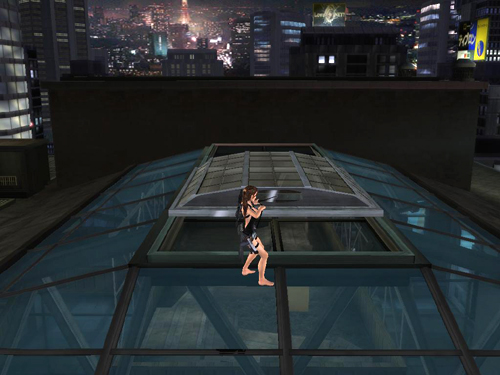 NISHIMURA'S ROOF: Go through the glass doors on the left past CHECKPOINT 3. If you explore the rooftop a bit, Lara and her helpers will converse over the headset, commenting on which building is Takamoto's, the state of the broken pedestrian bridge, etc., but this isn't necessary to advance the action.