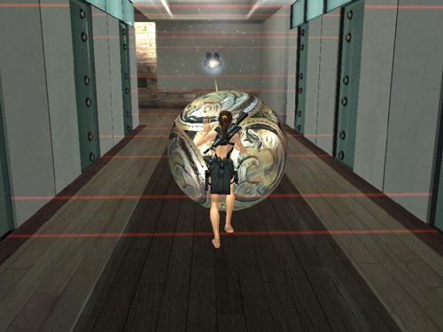Return to the hall, pull the ornate carved ball off its stand and have Lara roll it ahead of herself as a shield from the gun turret. (screenshot) After clearing the danger zone, continue along the hallway and through the door.