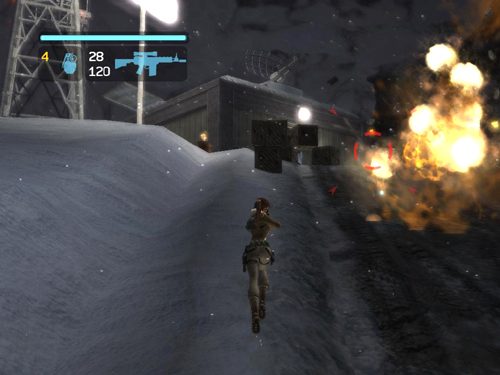 COMMAND CENTER: As soon as you do, the 2 soldiers at the top of the hill start rolling explosive barrels down toward you. The most direct strategy here is to run through the gate past CHECKPOINT 5. The gate then closes behind Lara, so there's nowhere to go but up. Run up the hill along the snowbank at the left edge of the road, so the barrels won't hit Lara. If you run with weapon drawn, tapping Interact as you go, you should be able to destroy all the barrels. (screenshot) If the soldiers survive the explosions, finish them off when you reach the top.