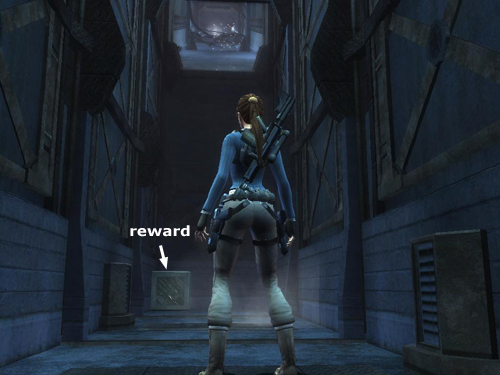 Go up the steps to the left. Lara comments on the map below. Grapple the cage door ahead and pull it open. Jump across the gap in the walkway into the cage, shoot the crate and retrieve a silver reward (2/3). (These screenshots show how to reach the reward.)