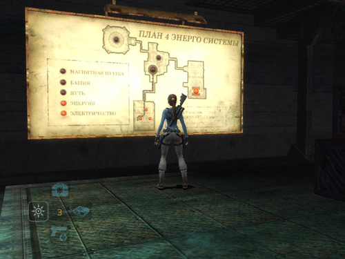 NOTE: For those of us who don't read Russian, Andreas has kindly provided translations for the sign. Title: Energy System Plan. Section with lighted buttons at bottom left: Magnetic Guns, Tower, Path, Energy/Power, Electricity. Apparently, since the "you-are-here" light is lit for this room, "Electricity" indicates the generator you just activated. (screenshot)