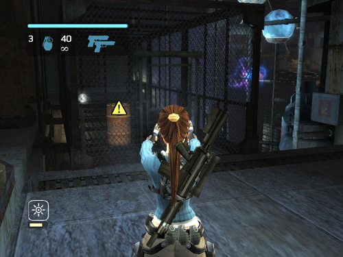 USING THE TESLA GUN: Three soldiers in riot gear emerge onto the ledge across the room. You can take them out using the Tesla gun, which is now fully operational. Using the gun effectively may take a little practice, though. It works as a powerful electromagnet. When the gun is pointed at an object that can be manipulated, the targeting reticle turns red. Press and hold the Target Lock button (G/L1/LT) to pull/pick up objects and the Fire button (left mouse/R1/RT) to push/throw them.