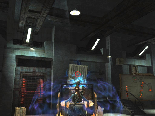 LARGE ROOM WITH TESLA GUN AND TOWER (AGAIN): The cage moves along the track until it reaches the tower. Then it stops. Stand to the left of the door with the high voltage symbol. Use the magnetic grapple to slide the door open. The cage rolls inside, completing some circuit, and the main power comes on. (screenshot)