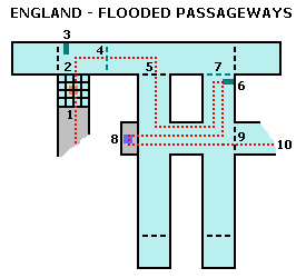 Hop down into the water on the other side of the opening. Swim forward, turn left, swim forward toward another metal gate (9), then turn left again. At the end of this passage is yet another gate, beyond which you can see the coffin Lara was just riding. On the right, just below the surface of the water, is another lever (6). Pull it to open the gate (7).