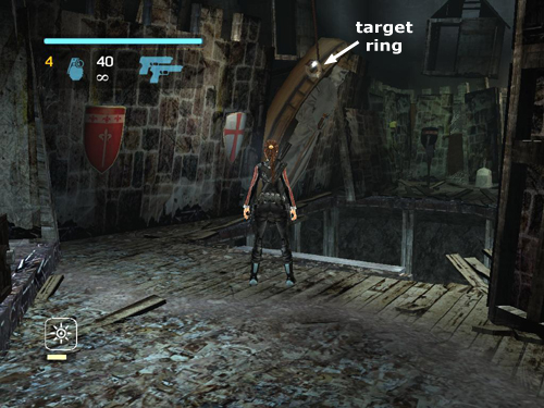 Turn the flame trap off if you turned it on. Then follow the hall back to the room with the spinning blades. Take out the second pair of mercenaries on the ledge to the left. One of them throws grenades and will jump down to the floor if he has a chance. When you've dealt with him, you can use the metal cage for cover as you take out the other man.