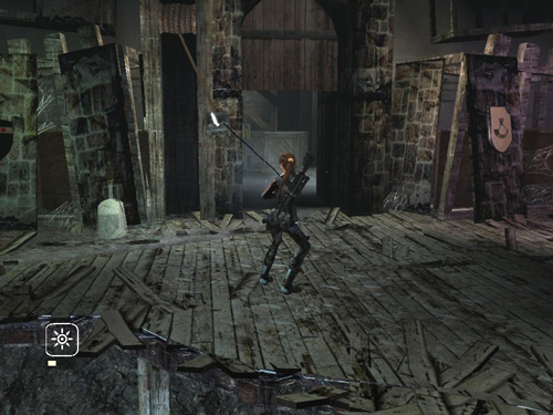 KING ARTHUR'S COURT EXHIBIT: Throughout this area, you can press buttons to activate the various exhibits. These elicit anguished comments about historical inaccuracy from Alister and a few jokes from Zip. Mind the hole in the floor. If Lara does fall through, there's a pile of debris and a makeshift ladder she can use to climb out. (screenshot)