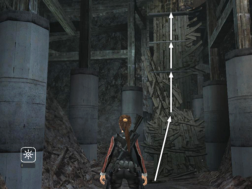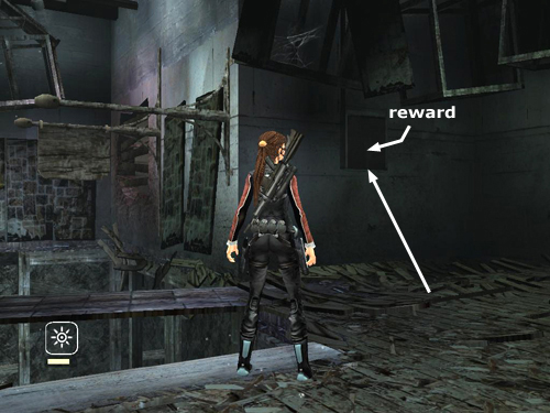 NOTE: There are movable stone panels on both of the high ledges. Like the one at the bottom of the tall room with the broken stairs, these panels are also used in obtaining the gold reward. Since you'll be returning this way at the end of the level, you can ignore them for now.